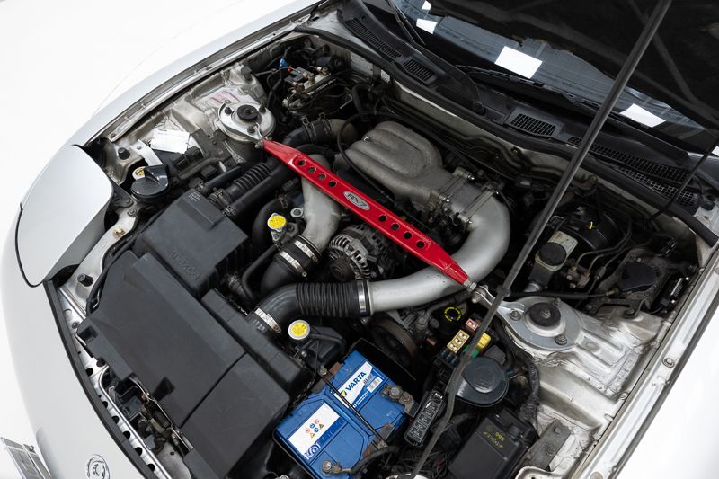 Het lakwerk vertoont sporen van normaal gebruik. De onderzijde toont oppervlakkige roest, met bijkomende aandachtspunten zoals een lekkage aan de turbo en een achterste deel van de uitlaat dat niet origineel is.